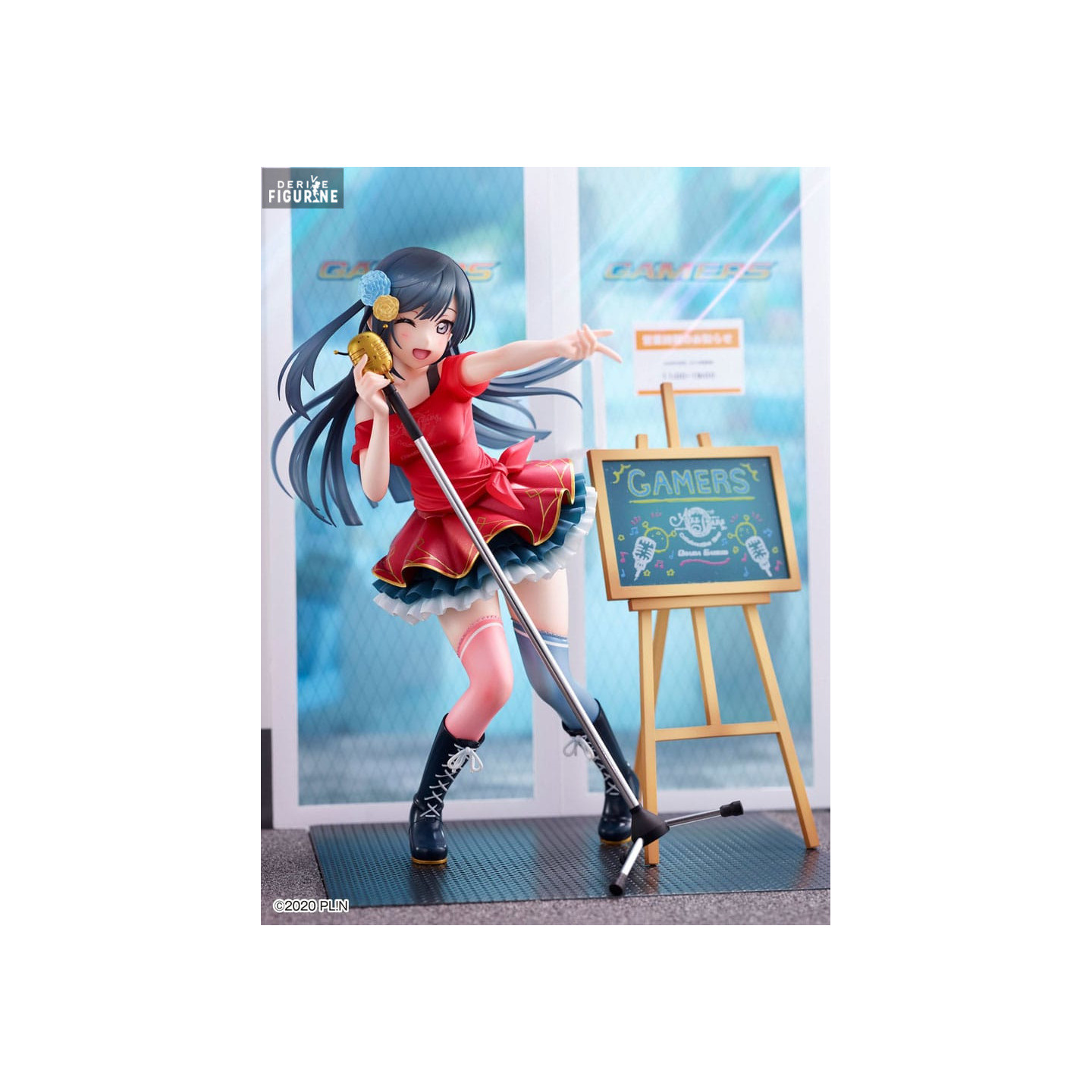 La figurine Odaiba Gamers Signboard Girl capture Setsuna dans une pose pleine de vie et d’enthousiasme. Vêtue d’une tenue colorée et élégante, avec une jupe à volants et des accessoires soigneusement détaillés, elle est représentée dans un moment d’animation, tenant un micro doré à la main. Son sourire éclatant et sa posture confiante rappellent les performances électrisantes qu’elle livre dans la série. La figurine est accompagnée d'un panneau "Gamers" qui ajoute une touche unique, faisant référence à l’univers du jeu et de la musique dans lequel elle évolue. L’attention portée aux détails, du mouvement de ses cheveux à l’expression de son visage, reflète l’esprit de Setsuna et son énergie débordante.