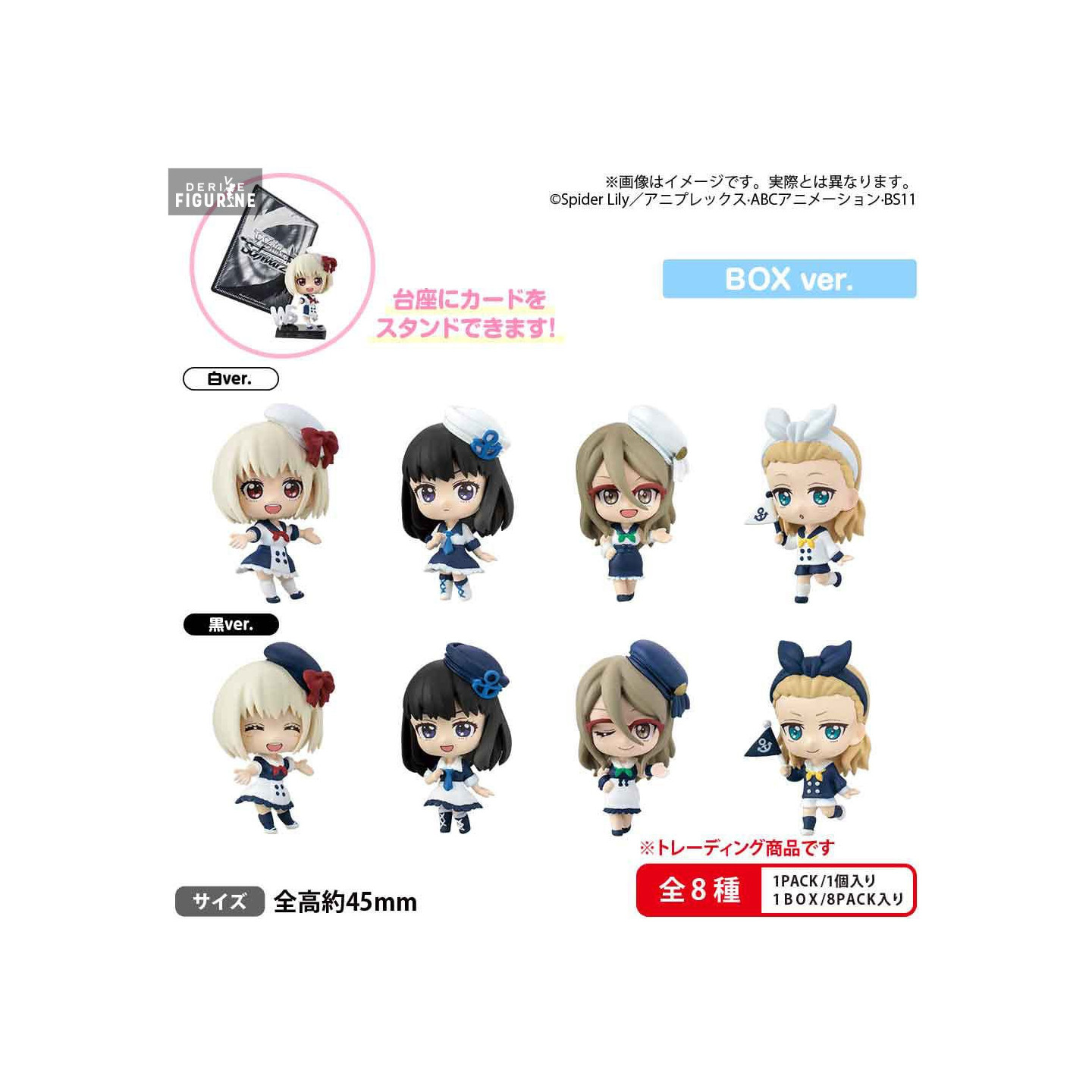 Figurines officielles de Lycoris Recoil en PVC mesurant environ 4,5 centimètres de haut. Elles sont issues de la collection Shirokuro Capsule. Le fabricant est Bushiroad.