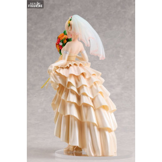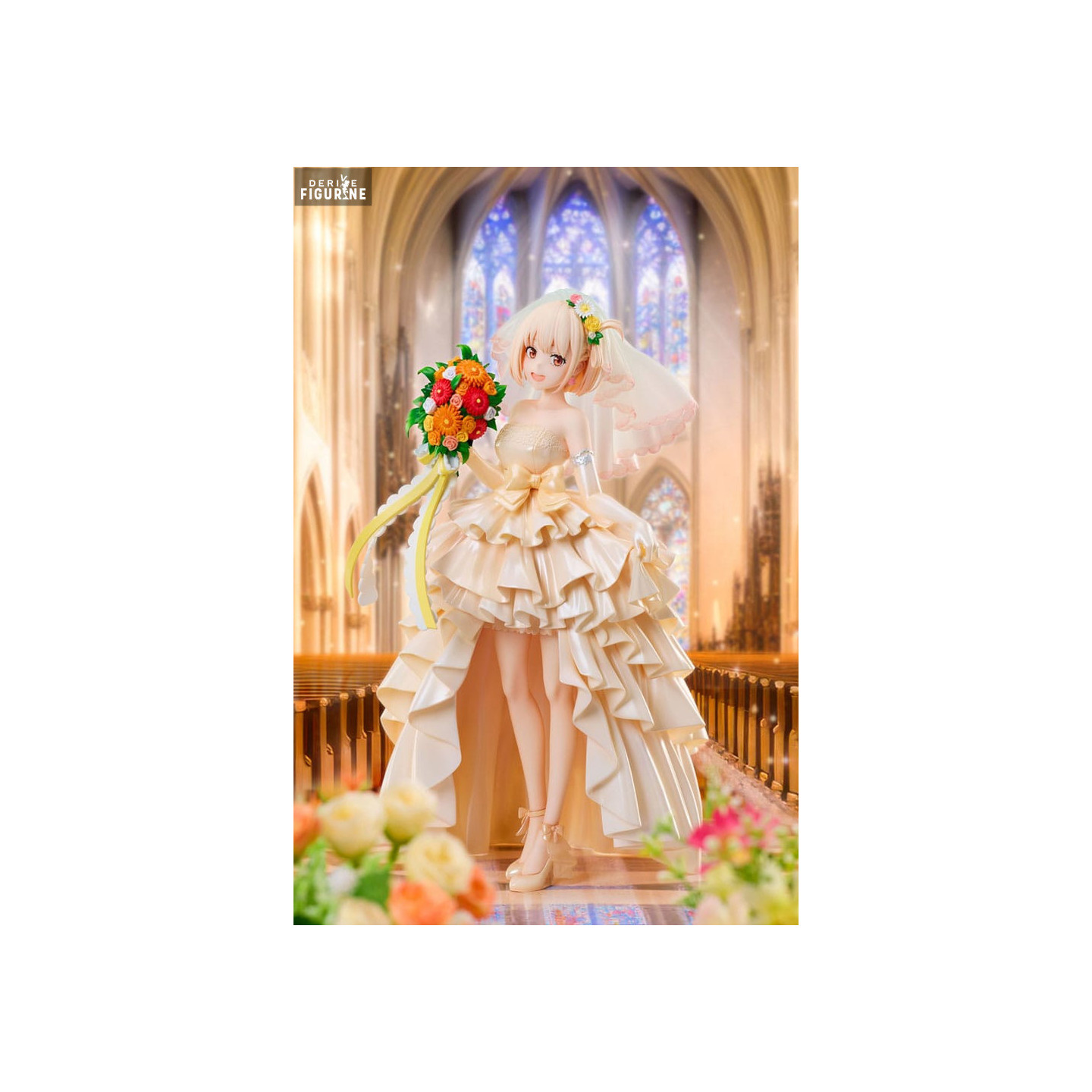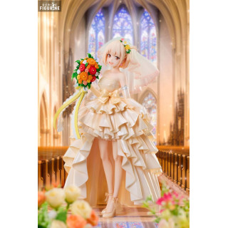 La figurine présente Chisato dans une pose gracieuse, tenant un bouquet de fleurs éclatantes aux couleurs vives, symbolisant la joie et la célébration. Sa robe de mariée est une véritable œuvre d'art, avec des volants délicats et des motifs détaillés qui ajoutent une texture riche et une profondeur visuelle impressionnante. La finesse des détails, des plis de sa robe à la transparence de son voile, démontre un savoir-faire exceptionnel.
