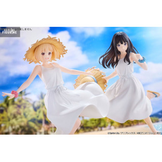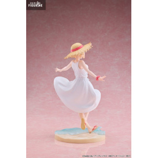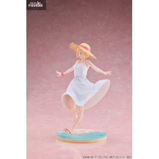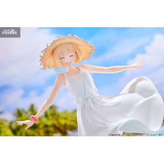La figurine brille par sa simplicité maîtrisée : la robe blanche en tissu léger laisse deviner les mouvements du vent, tandis que le socle représente un petit bord de plage stylisé, avec eau turquoise et sable doux. Le tout dégage une atmosphère paisible et solaire, à l’image de Chisato.