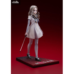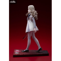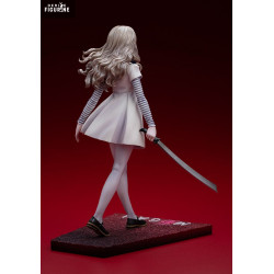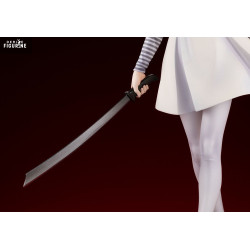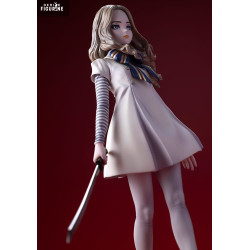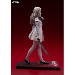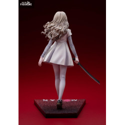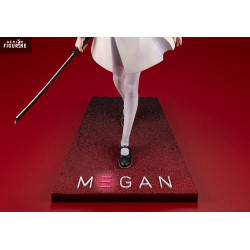 La figurine reprend avec précision son allure iconique. On retrouve sa robe claire au tombé rigide, ses manches rayées, son nœud bleu et jaune, ainsi que sa longue chevelure ondulée. Son visage reste neutre mais troublant, avec un regard droit et froid. La posture avancée, sabre en main, renforce le contraste entre apparence enfantine et danger. Le socle rectangulaire affiche le nom « M3GAN » dans un dégradé rouge sombre.