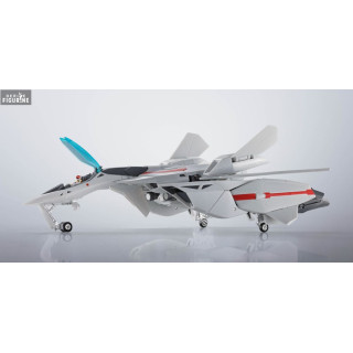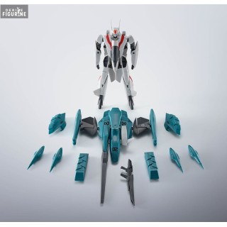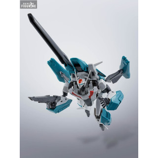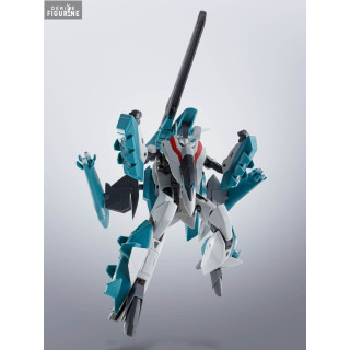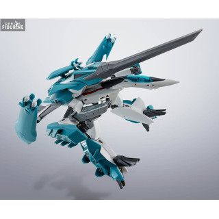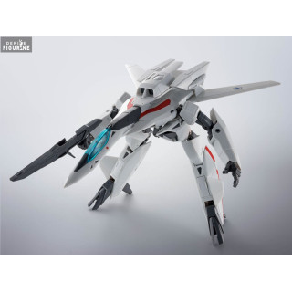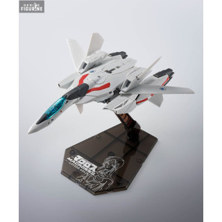 Figurine officielle de VF-2SS Valkyrie II + SAP (Silvie Gena use) en métal mesurant environ 16 centimètres de haut. Elle est issue de la collection Hi-Metal R. Le fabricant est Bandai.