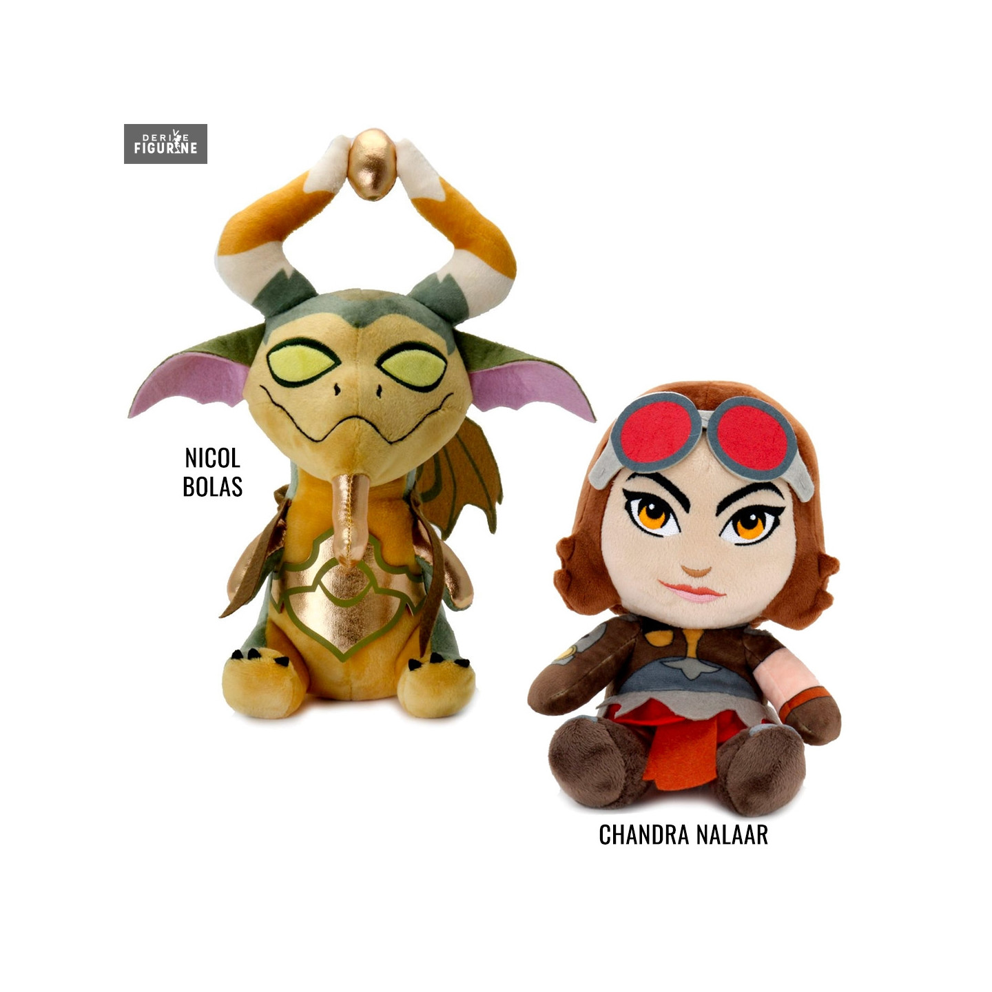 Chandra Nalaar est l'une des nombreux planeswalkers que l'on peut retrouver dans Magic the Gathering et a la capacité de maîtriser le feu. En face d'elle, vous avez Nicol Bolas, le plus méchant et puissant dragon du jeu. Malgré tout, il est tout de même très mignon dans cette version peluche. A vous maintenant de choisir de quel côté vous êtes...