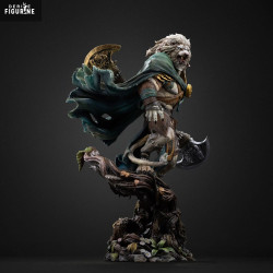 Les détails de la sculpture mettent en valeur les textures naturelles : fourrure, bois, tissu et métal s’harmonisent parfaitement. La peinture subtile renforce les contrastes entre les matières — du bois moussu du socle à la patine de la hache et aux reflets du médaillon d’Ajani.
