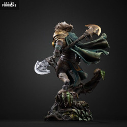Éléments spéciaux : socle sculpté en tronc d’arbre, cape en mouvement, hache détaillée, textures multiples