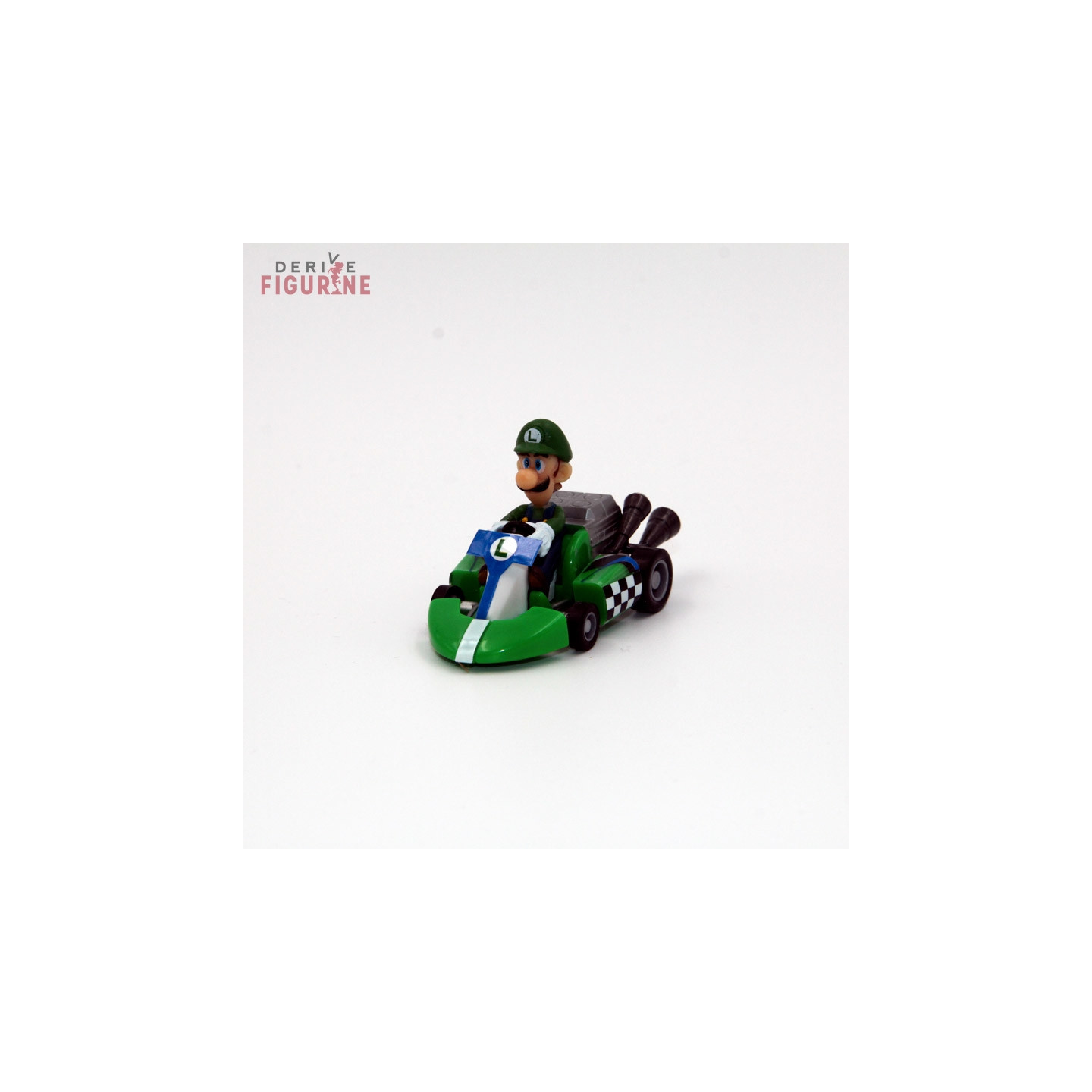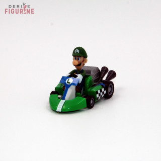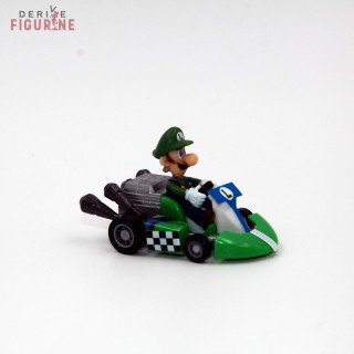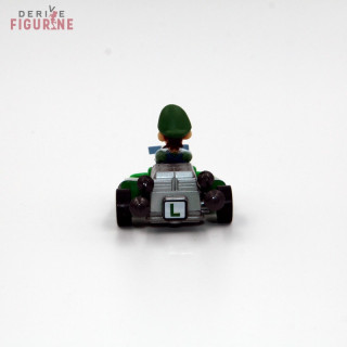 Figurine d'occasion et officielle de Luigi en ABS/PVC d'environ 3,5 centimètres de haut. Luigi est au volant de son kart à friction, accrochez-vous la course va commencer. Il s'agit d'un objet d'occasion en parfait état, mais certains autocollants se décollent un peu. Le fabricant est Takara Tomy ARTS, vendu dans une boule en plastique rouge.