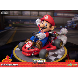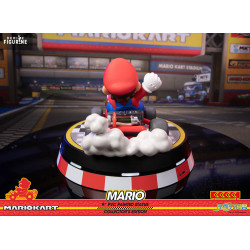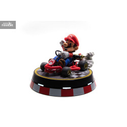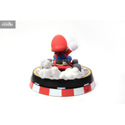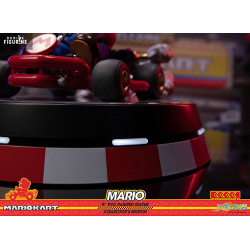 Tous les éléments sont fidèles au design du jeu : casquette rouge avec le "M", salopette bleue, moustache bondissante, gants blancs, mais aussi détails du kart comme les roues, les pédales ou le châssis tubulaire. Le socle circulaire imite une ligne de départ quadrillée en damier, avec un effet de finition brillant et une base renforcée.