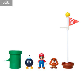 Plongez dans l’univers coloré de Super Mario avec ce diorama inspiré de la plaine du Grand Chêne. Cet ensemble reprend l’un des décors les plus emblématiques de la franchise, où Mario, fidèle à lui-même, s’élance vers le drapeau final après avoir bravé les nombreux obstacles semés sur son chemin. Aux côtés du célèbre plombier en salopette rouge, on retrouve deux de ses ennemis classiques : un Goomba posté au sommet d’un tuyau vert et un Bob-omb prêt à exploser.