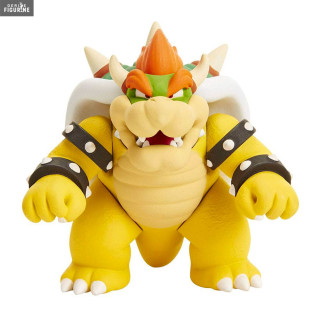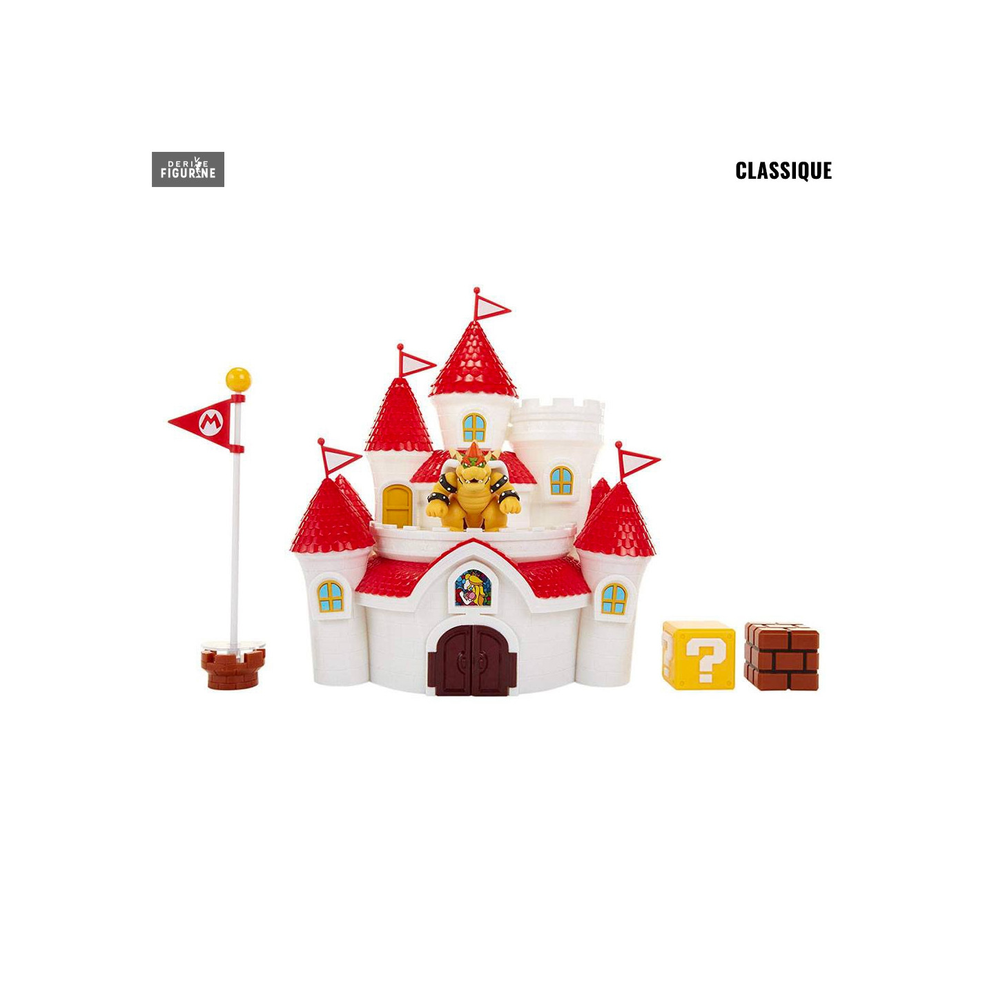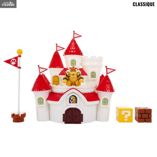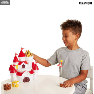 Le set inclut également quelques éléments incontournables de l’univers Mario, comme un drapeau à hisser à la fin du niveau, un bloc “?” et un bloc de briques. La figurine de Bowser, fidèle à son apparence imposante dans les jeux, trône sur le balcon central, prêt à revendiquer le château. Ce décor peut accueillir d'autres figurines de la collection Jakks Pacific, permettant de créer des scènes interactives ou de simplement le mettre en valeur dans une collection.