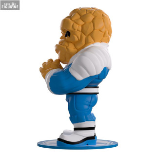 Cette figurine officielle Youtooz le représente dans une posture atypique et amusante, les mains jointes devant lui, comme s’il préparait un geste de remerciement ou un salut respectueux. Son costume bleu et blanc des Quatre Fantastiques est fidèlement reproduit, avec son emblème “4” bien visible sur la ceinture. Sa tête et son corps affichent les reliefs irréguliers de sa “peau” rocheuse, avec un style stylisé propre aux créations Youtooz.