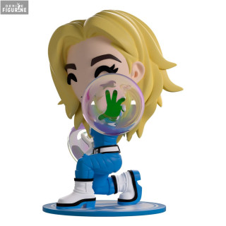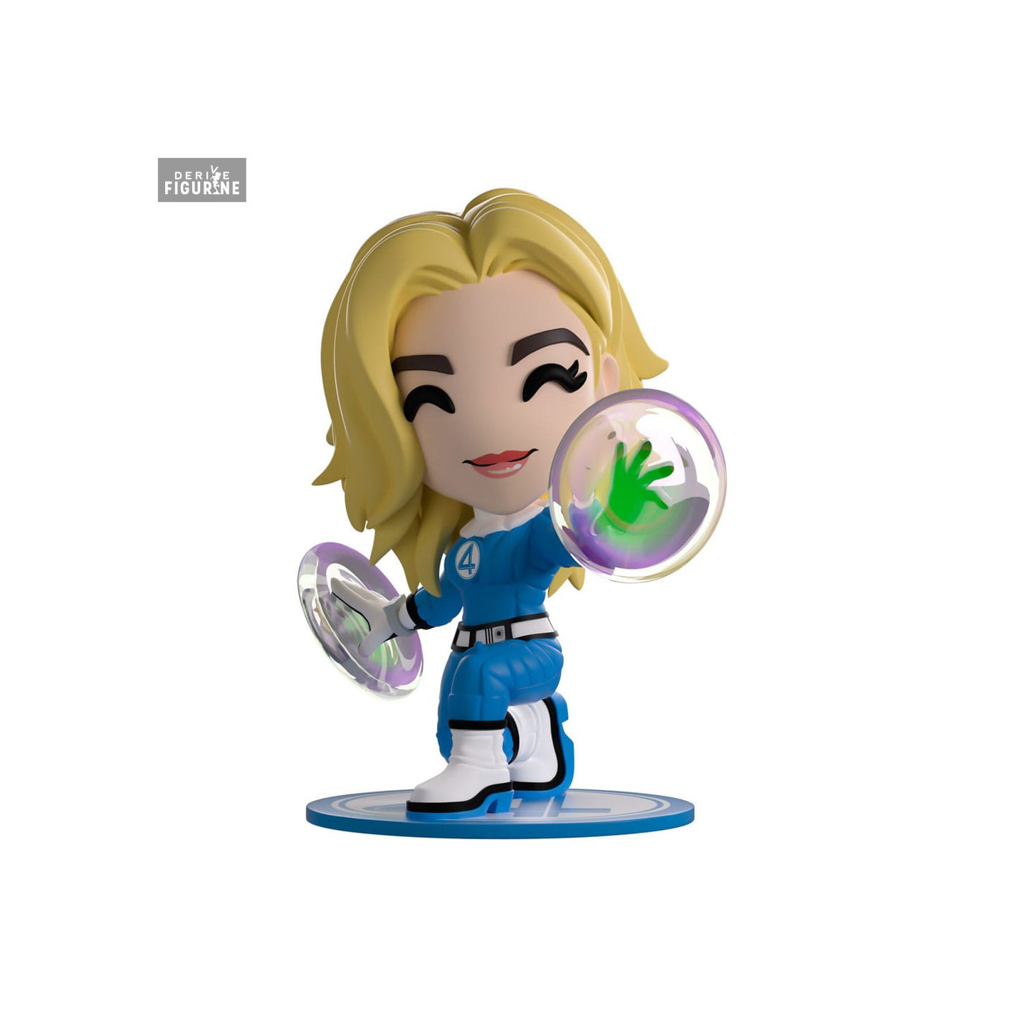 Cette figurine officielle Youtooz la représente dans une pose dynamique et confiante : un genou au sol, les mains levées projetant deux champs de force translucides aux reflets violets et verts. Son visage souriant et ses yeux rieurs reflètent son assurance, tandis que ses cheveux blonds encadrent élégamment son visage. Elle porte sa combinaison bleue iconique ornée du logo “4”, accompagnée de gants blancs et de bottes assorties.