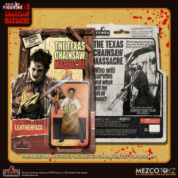 Figurine officielle de Leatherface mesurant environ 10 centimètres de haut. Elle est issue de la collection 5 Points. Le fabricant est Mezco Toys.