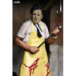 La figurine reprend son apparence emblématique : masque cousu, chemise claire légèrement rayée, cravate sombre et grand tablier jaune taché de traces rouges. On distingue ses cheveux noirs ébouriffés, son pantalon sombre et ses chaussures épaisses. Les images montrent plusieurs accessoires, notamment un marteau et une tronçonneuse. La tenue en tissu lui donne un aspect plus réaliste, fidèle à la gamme Clothed de NECA.