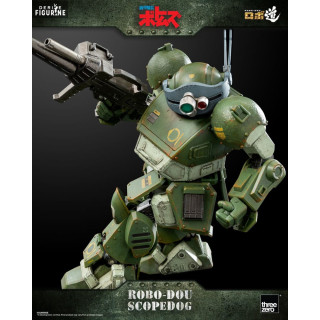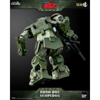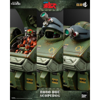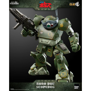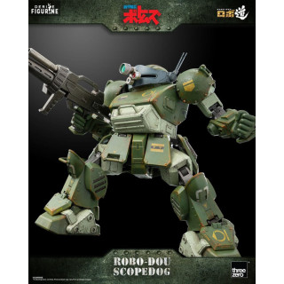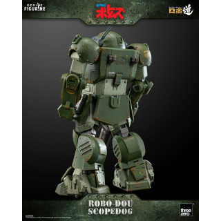 Figurine officielle de Robo-Dou Scopedog mesurant environ 16 centimètres de haut. Le fabricant est ThreeZero.