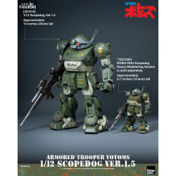 Mesurant environ 15 cm de haut, le Scopedog est fabriqué avec soin par ThreeZero. Il offre de nombreuses options de pose, un niveau de détail remarquable et une finition réaliste, fidèle au style industriel de la série. Un must pour tout fan de VOTOMS, qu’il s’agisse d’exposition ou de mise en scène dynamique.