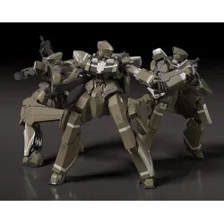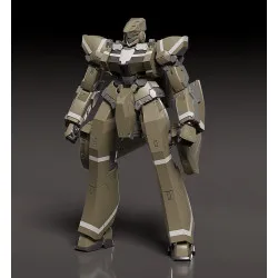 Visuellement, l’Areion est habillé d’un kaki/olive uniforme, rythmé par des bandes gris clair sur les bras et les jambes, et des zones gris foncé visibles aux articulations et dans la structure interne. La tête est compacte, anguleuse, avec une face avant en panneau lisse façon capteur/visière. Le torse superpose des plaques épaisses, tandis que la taille est ceinturée par des éléments d’armure qui tombent comme un “tablier” rigide. Dans une main, il tient un fusil noir aux lignes carrées, et l’autre bras présente un gros bloc d’armure avec une forme qui évoque un module ou un support d’équipement. Les jambes, très massives, se terminent par de grands pieds plats; posé ainsi, il occupe bien l’espace sur une étagère sans avoir besoin d’une pose acrobatique.