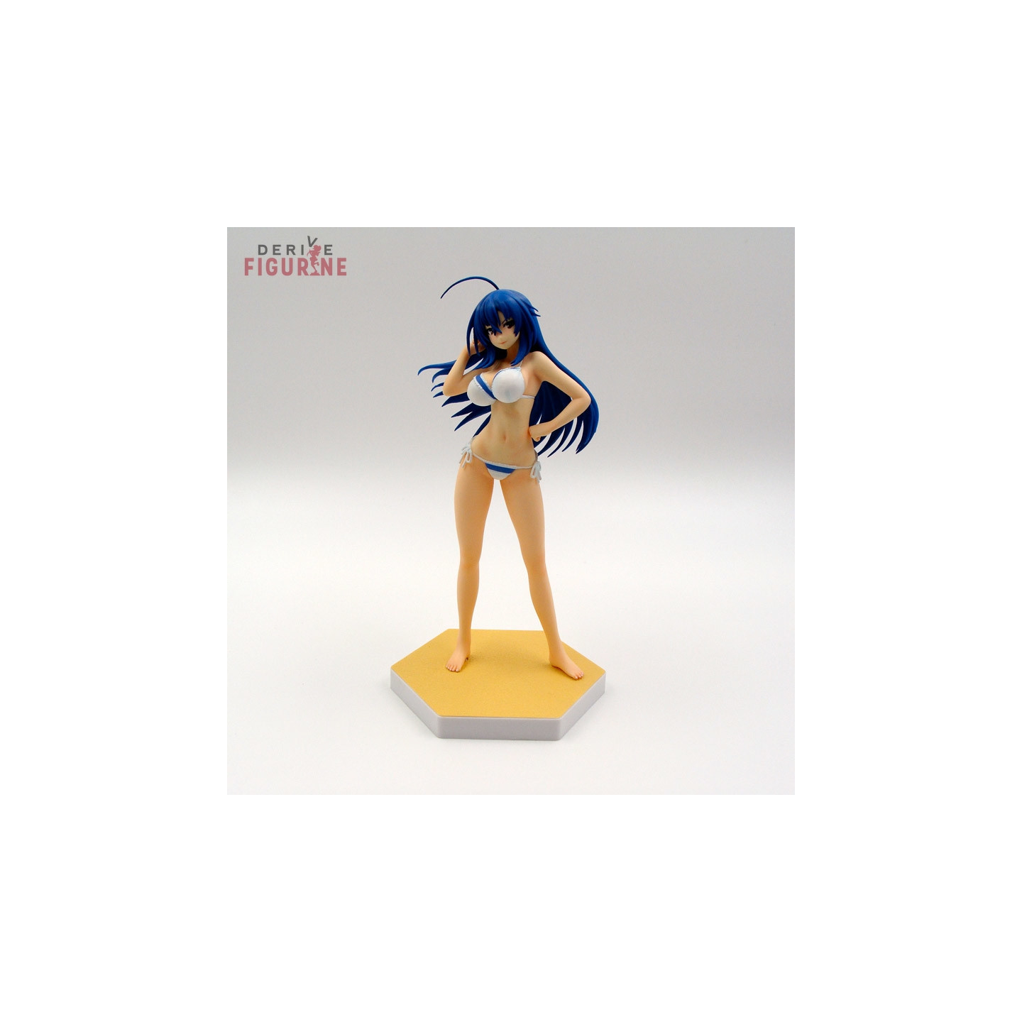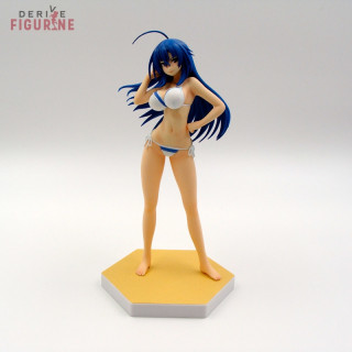 Figurine d'occasion et officielle de Médaka Kurokami en ABS/PVC d'environ 17 centimètres de haut à l'échelle 1/10. Médaka porte un petit maillot de bain blanc avec un rebord bleu. Il s'agit d'un objet d'occasion en parfait état de la collection Beach Queens. Le fabricant est Wave Corporation, vendu avec boîte en bon état.