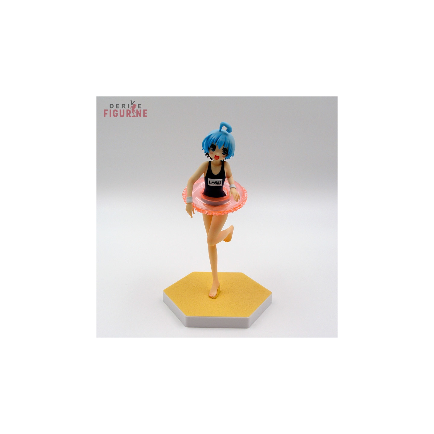 Figurine d'occasion et officielle de Hansode Shiranui en ABS/PVC d'environ 14 centimètres de haut à l'échelle 1/10. Hansode porte un maillot de bain une pièce bleu et une bouée rose autour de la taille. Il s'agit d'un objet d'occasion en parfait état de la collection Beach Queens. Le fabricant est Wave Corporation, vendu avec boîte en bon état.