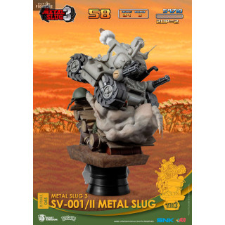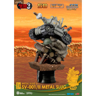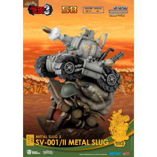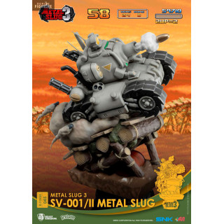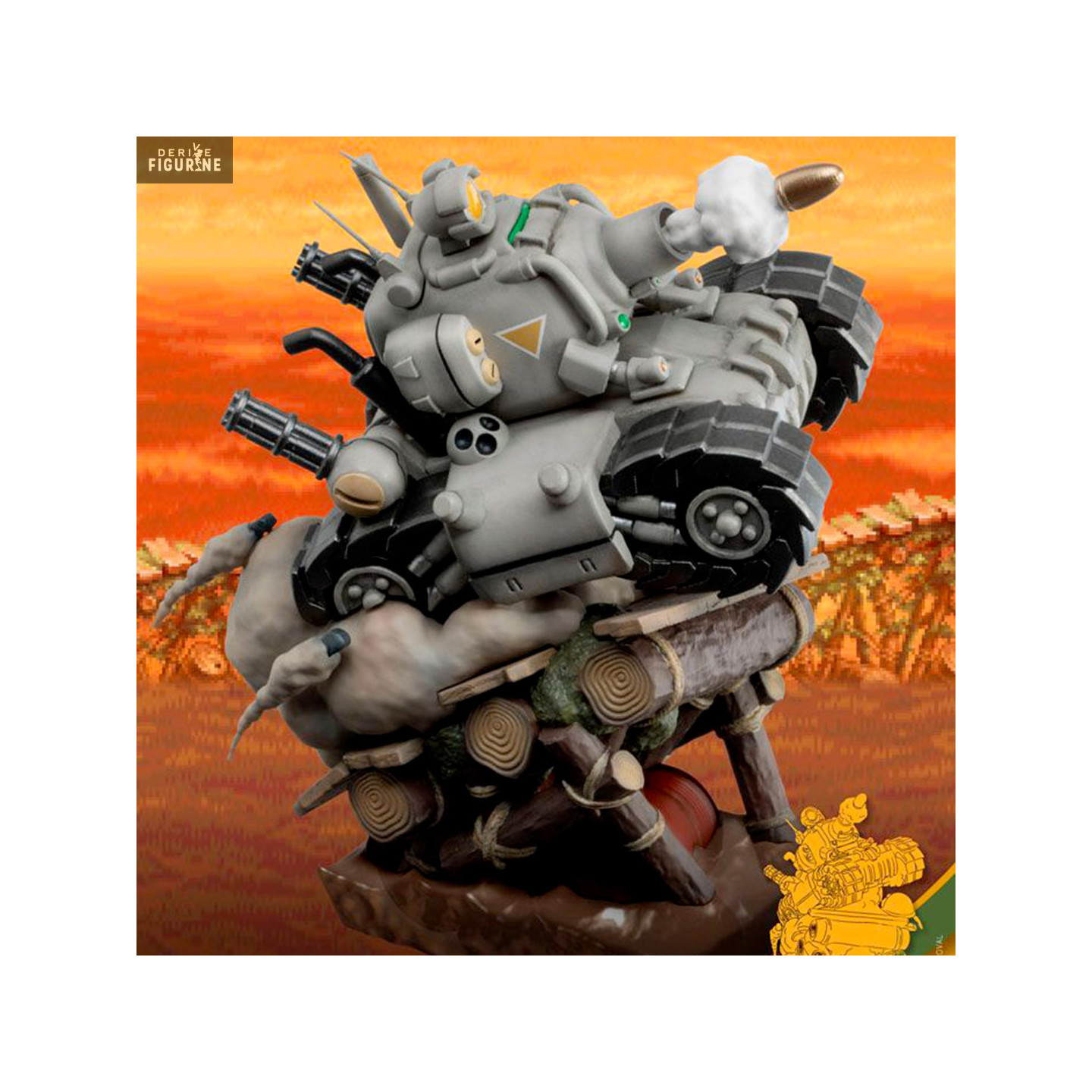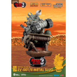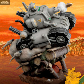 Le SV-001 est un petit char que vous pourrez jouer avec la Regular Army dans Metal Slug. Vous pouvez le voir rouler à toute allure sur des rondins de bois et même un casque au sol, tout en tirant sur les ennemis qui se trouvent face à lui. Cette figurine est donc parfaite pour les fans de Metal Slug.