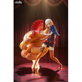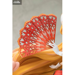 Sa posture dynamique — éventail rouge levé, jambe fléchie, regard intense — dégage une force tranquille, accentuée par sa tenue audacieuse et son incroyable chevelure dorée sculptée en volutes géantes. Cette dernière, véritable pièce maîtresse de la figurine, semble capturer le souffle du vent, donnant un effet de mouvement et de puissance ininterrompue.