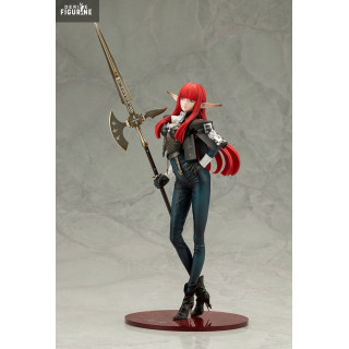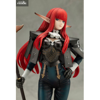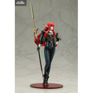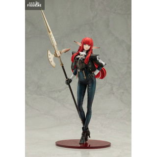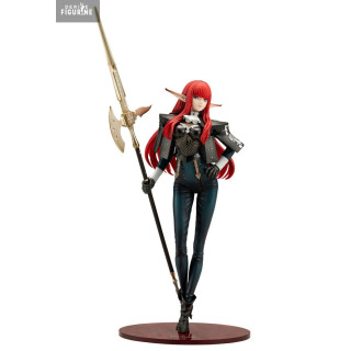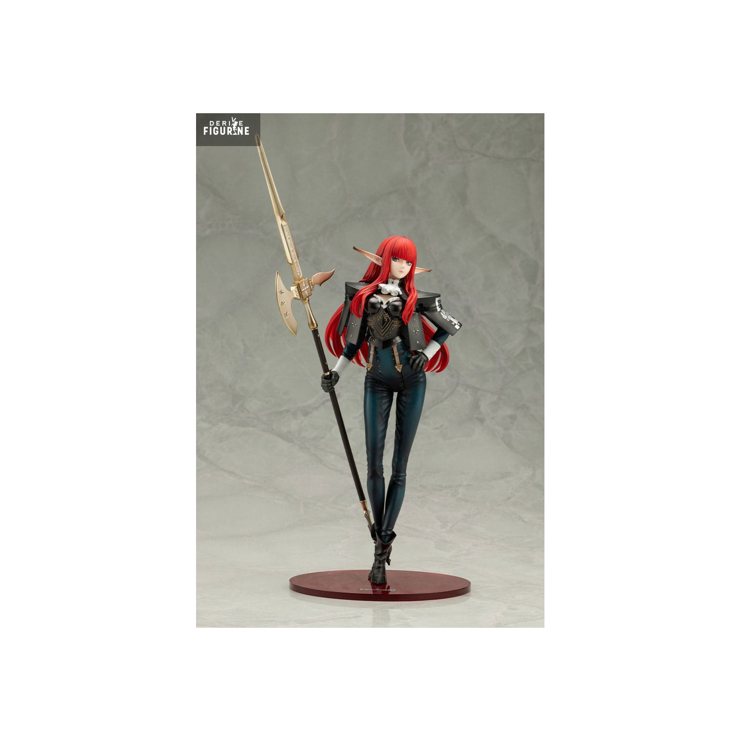 Sur cette sculpture, tu la retrouves debout, fière et imperturbable, une lance majestueuse à la main. Sa chevelure rouge écarlate tombe en cascades fluides jusqu’au bas de son dos, soulignant ses oreilles d’elfe délicates. Son armure aux épaulières larges, ses gantelets ouvragés et son pantalon ajusté dévoilent un travail de sculpture précis, tandis que la finition métallisée de sa lance crée un contraste saisissant avec la texture satinée de son vêtement.