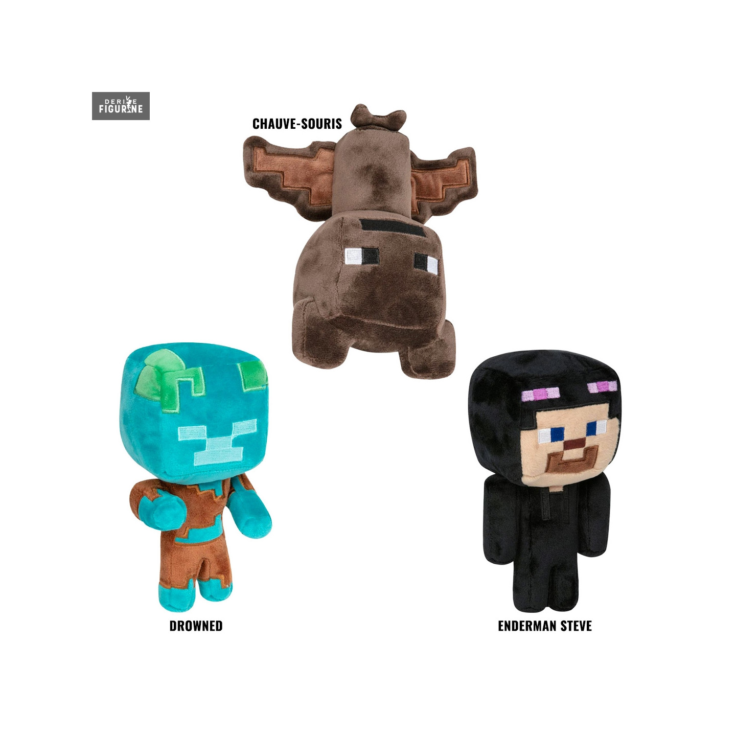 Peluche officielle au choix entre la Chauve-souris (~14 cm), Drowned (~18 cm) ou Enderman Steve (~18 cm) en 100% polyester. Elle est issue de la collection Happy Explorer. Le fabricant est J!NX.