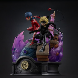 Sur la pièce, Ladybug est accroupie, costume rouge couvert de pois noirs parfaitement sculptés, cheveux bleus attachés en couettes et yo-yo à la main. Derrière elle, Chat Noir est campé sur une autre partie du toit, costume noir moulant, ceinture-clochette et queue de chat stylisée relevée derrière lui. Ils se tiennent sur un bâtiment aux tuiles bleu-vert et briques détaillées, avec cheminées et rebords de toit. À l’arrière, des volutes d’énergie violette translucide entourent la scène, comme une explosion de pouvoir ou l’aura d’un vilain en train d’attaquer. Le tout repose sur un socle travaillé façon piédestal, avec un médaillon à l’avant qui rappelle l’emblème de la série.