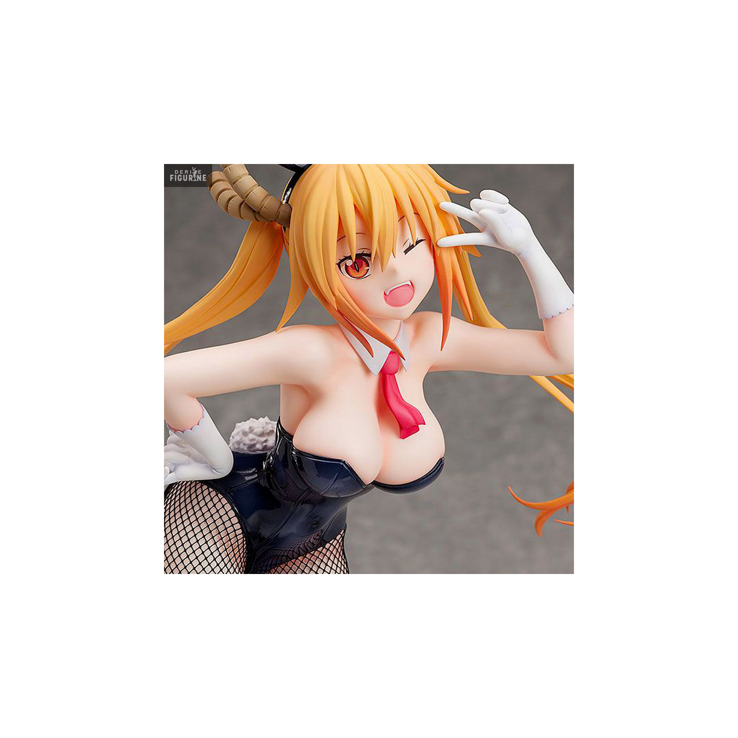 Tohru (Thor), sorti tout droit de la série Kobayashi-san Chi no Maid Dragon est une femme dragon aussi bien puissante que pleine d'humour. Débarquée tout droit dans le monde des Hommes, elle a été recueillie par Kobayashi. Elle en devient la servante et la suit dans son quotidien tout en essayant de ne pas faire de bêtises. Retrouvez là ici dans une tenue de Bunny girl, avec de grands bas résilles et un body en cuir mettant en avant sa généreuse poitrine, ainsi qu'un serre-tête à oreilles de lapin et un petit pompon blanc à l'arrière.