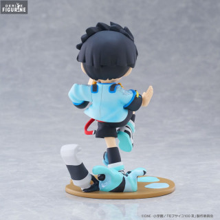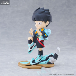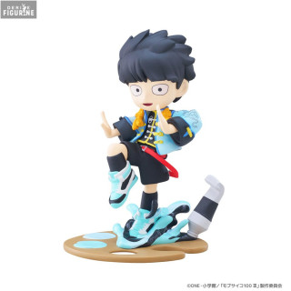 La figurine représente Mob dans une pose dynamique, vêtu de son uniforme traditionnel noir avec des bordures jaunes et des chaussures stylées aux détails turquoise. L'expression de son visage, avec ses grands yeux ouverts et son air concentré, reflète sa détermination et sa sérénité. Les touches de couleurs vives et les détails minutieux de la figurine, comme les plis de ses vêtements et les accessoires qui l'accompagnent, témoignent du soin apporté à cette création.