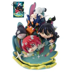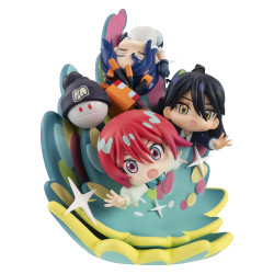 Visuellement, l’ensemble repose sur une base ronde aux tons vert d’eau bordée de jaune, décorée d’étoiles et de motifs colorés, d’où s’élèvent de grandes formes courbes en aplats turquoise, rose et vert. À l’avant, Amate Yuzuriha se distingue avec ses cheveux rouges et ses lunettes, les bras tendus et les yeux très ouverts; à droite, NyaanNyaan a des cheveux noirs et des yeux jaunes, dans une pose plus posée comme en suspension; en haut, Shuuji Itou est représenté à l’envers, les yeux fermés, avec des cheveux bleus, une tenue claire et un élément orange placé près de lui. HaroHaro complète la scène sur le côté sous forme de petite mascotte sombre. Le gift visible correspond à une carte illustrée reprenant le visuel du diorama, pensée pour accompagner l’exposition ou la collection.