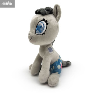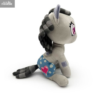 Le design de cette peluche reproduit fidèlement ses attributs distinctifs : un pelage gris doux, une crinière tressée en nuances de gris foncé, et ses yeux hétérochromes – l’un rose, l’autre bleu – soigneusement brodés. Sur son flanc apparaît un motif de patchwork à pois et un petit cœur, rappelant son esprit créatif et son amour du bricolage. Sa posture assise, oreilles dressées, traduit sa curiosité et son dynamisme.