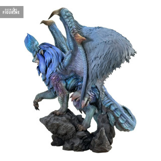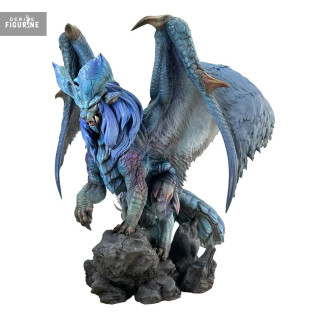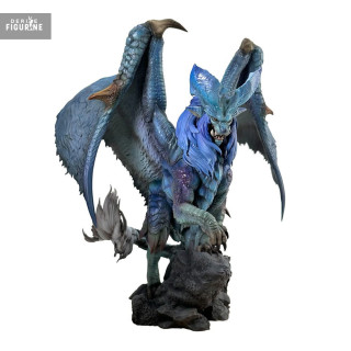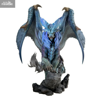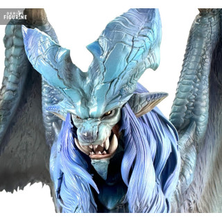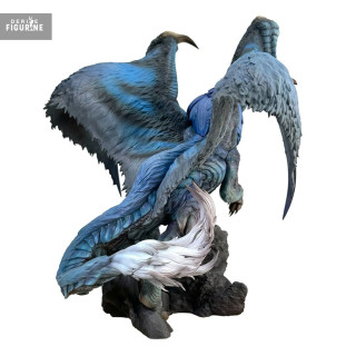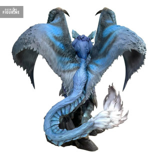 La figurine capture parfaitement la majesté de Lunastra avec une pose dynamique, déployant ses ailes gigantesques et montrant ses griffes acérées. Les écailles de son corps sont finement détaillées, révélant des nuances de bleu et de violet qui reflètent la lumière de manière spectaculaire. Son regard perçant et ses cornes imposantes ajoutent une touche d'intensité, soulignant son rôle de prédateur suprême.