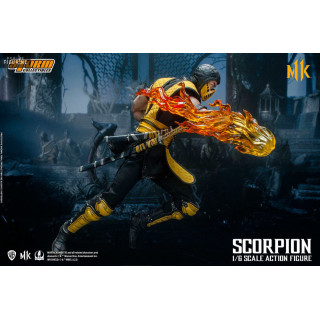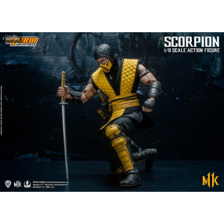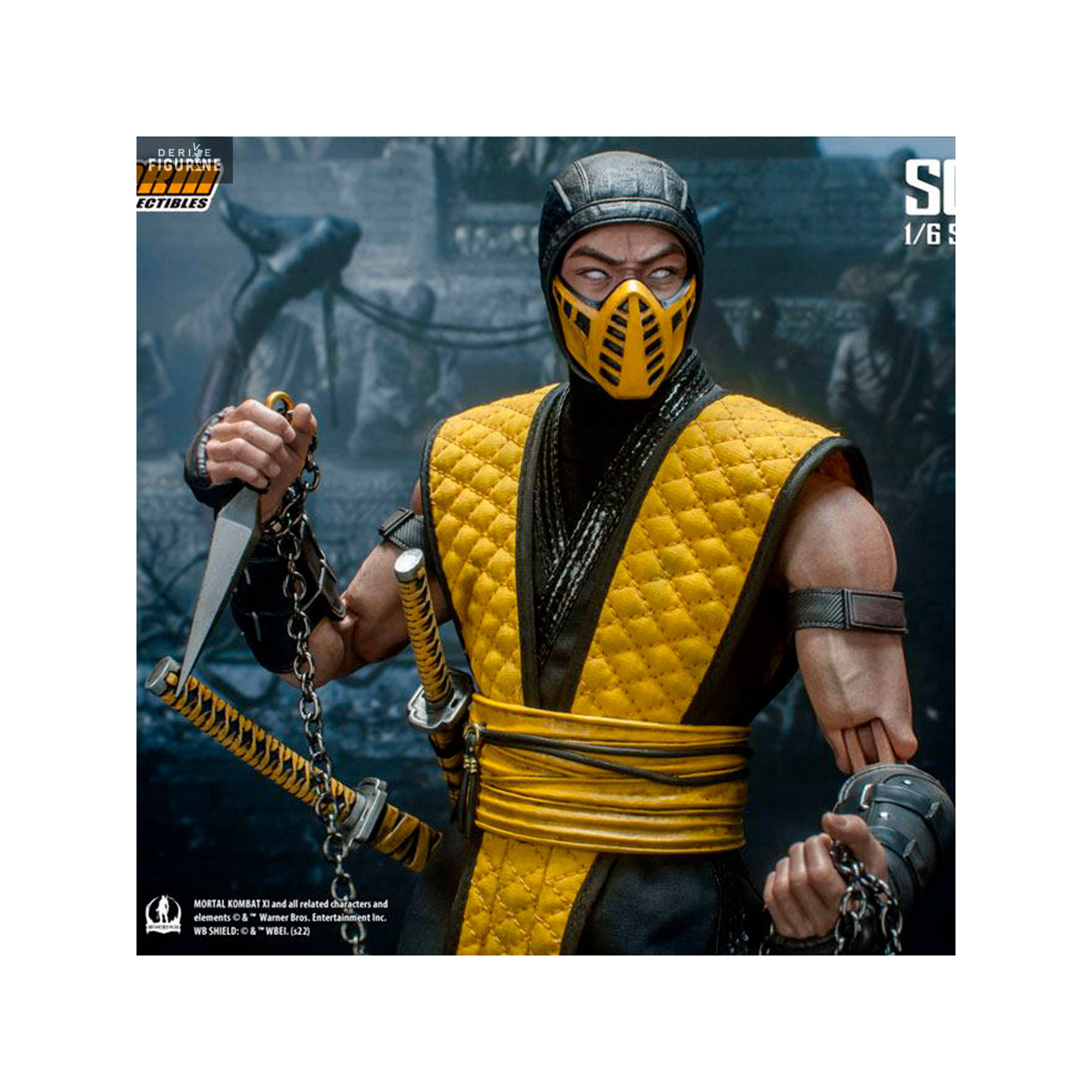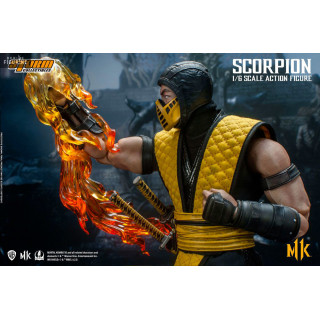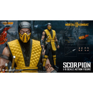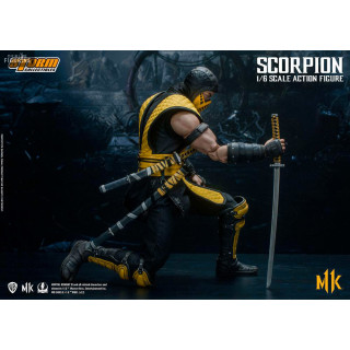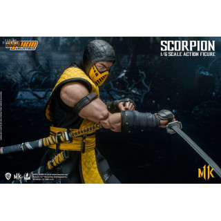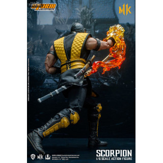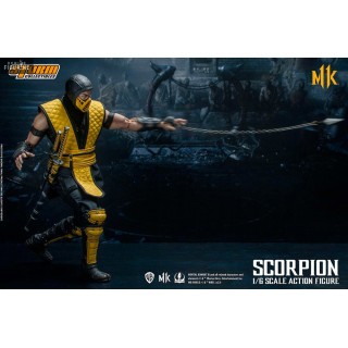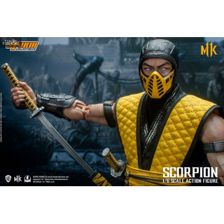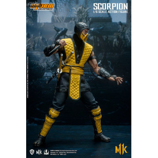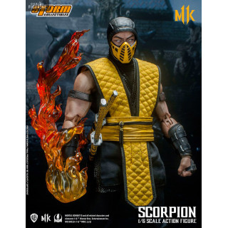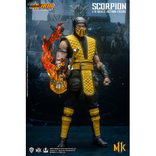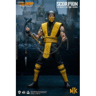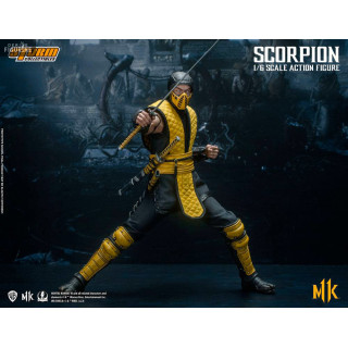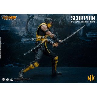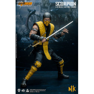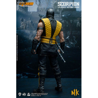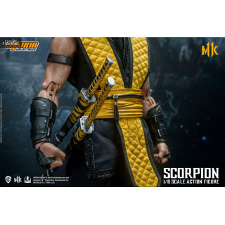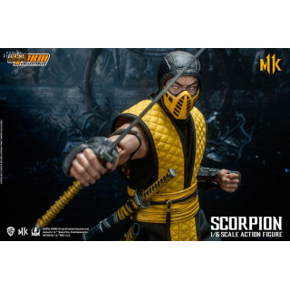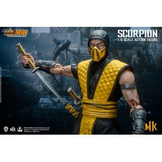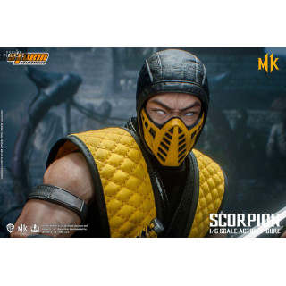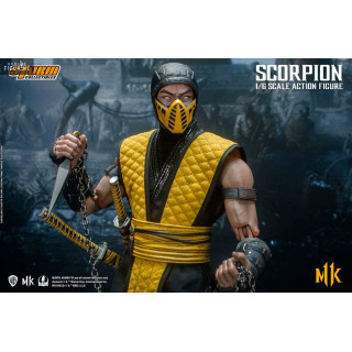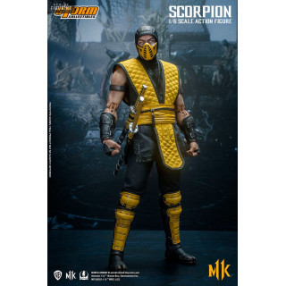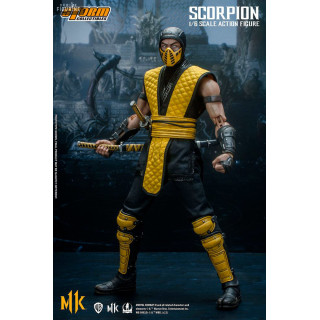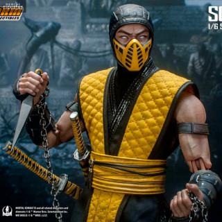 Figurine officielle de Scorpion mesurant environ 32 centimètres de haut, à l'échelle 1/6. Le fabricant est Storm Collectibles.