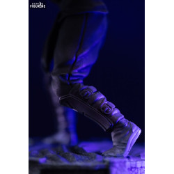 La figurine capture parfaitement son allure sinistre : entièrement vêtu de noir, il adopte une posture de combat dynamique, poings serrés et genoux fléchis. Son masque dissimule son visage, ne laissant paraître que sa présence spectrale. Les plis de sa tenue, ses bottes renforcées, ainsi que le socle texturé aux allures de pierre craquelée évoquent fidèlement l’atmosphère du jeu.