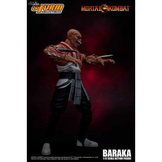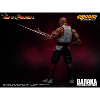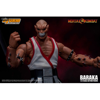 Baraka possède une dentition assez impressionnante et des lames extensibles au niveau des avant-bras. Cela vient du fait qu'il fait partie de la race des Tarkatan, un mélange entre les habitants d'OutWorld et des démons du NetherRealm. Il est vendu avec des visages et mains interchangeables.