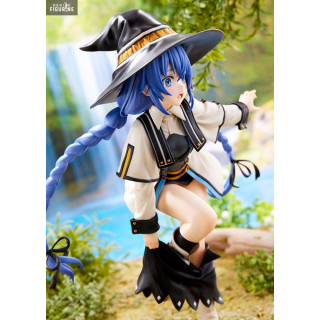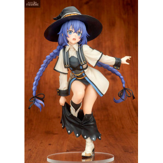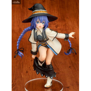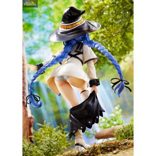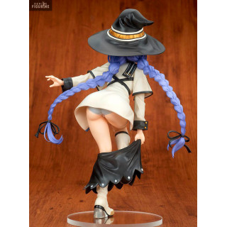 Cette représentation de Roxy capture un moment unique et expressif, avec une posture dynamique et une attention particulière portée aux détails. Sa tenue emblématique de mage, complétée par son grand chapeau de sorcière et ses longues tresses violettes, est fidèlement reproduite avec des touches raffinées. Les plis de son manteau et les ornements de sa tenue ajoutent une touche réaliste et élégante, tandis que son expression légèrement surprise ou inquiète donne vie à son caractère attachant.
