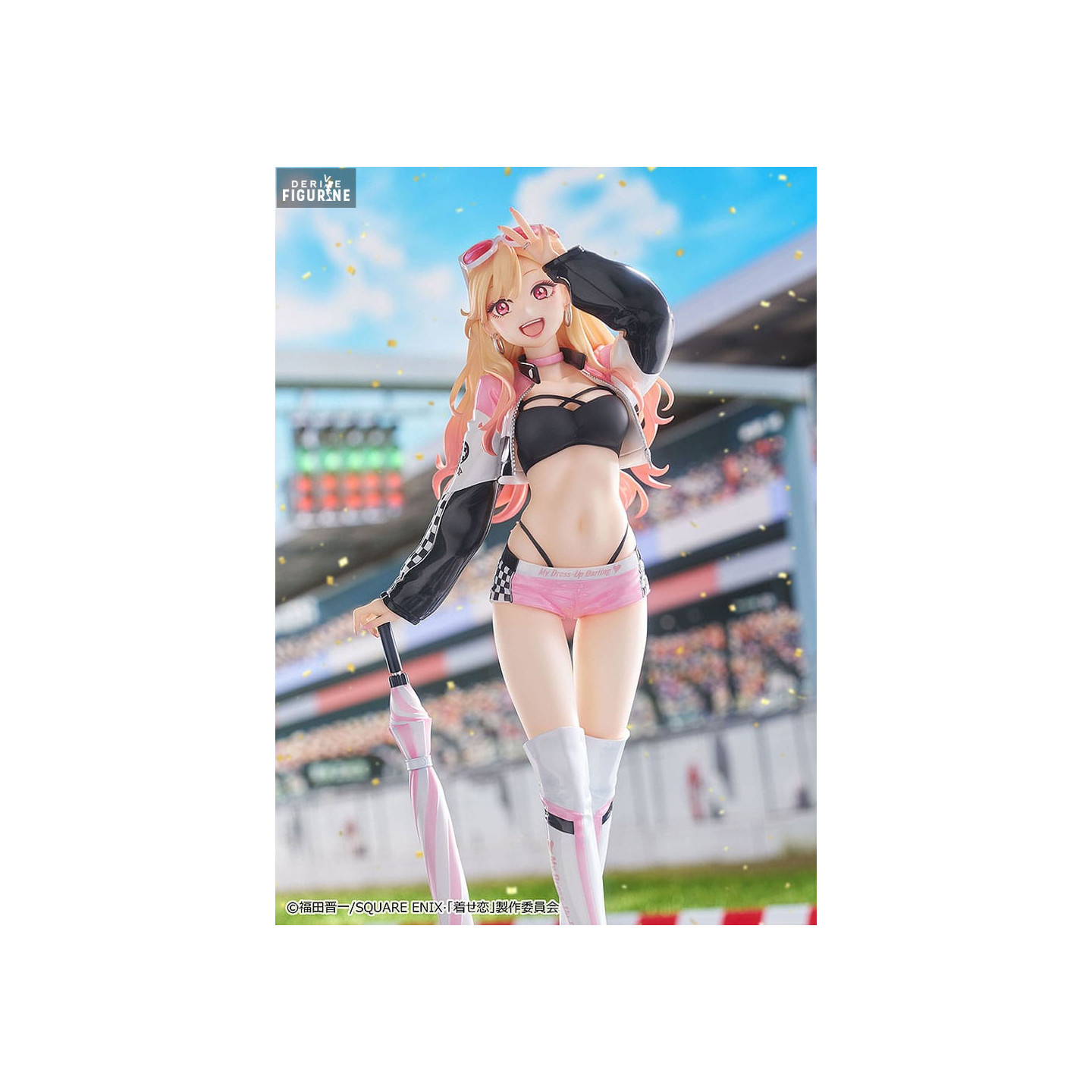 Cette somptueuse figurine à l’échelle 1/7 nous offre Marin dans un tout nouveau costume original de Race Queen, qui lui va comme un gant. Vêtue d’un ensemble noir et rose inspiré des paddocks de course, avec veste courte à damiers, micro-short, bottes hautes et parapluie coordonné, elle dégage une énergie électrisante. La posture dynamique, la main sur les lunettes, et l’expression joyeuse renforcent le charme et la vitalité du personnage.