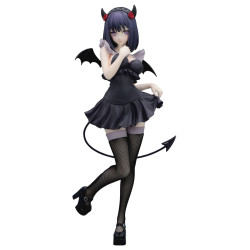 Le design visible sur la figurine s’appuie uniquement sur ce que l’on voit : une tenue noire ajustée, complétée par une jupe évasée, un col clair volumineux et des bas résille. Les petites ailes noires dans son dos, les cornes sombres ornées de rouge, ainsi que la queue fine terminée par une pointe renforcent le thème démoniaque. Sa posture légère, jambes croisées, et son expression douce mais distante donnent un mélange subtil de confiance et de retenue. Les chaussures à plateforme et les cheveux courts violets complètent la silhouette.
