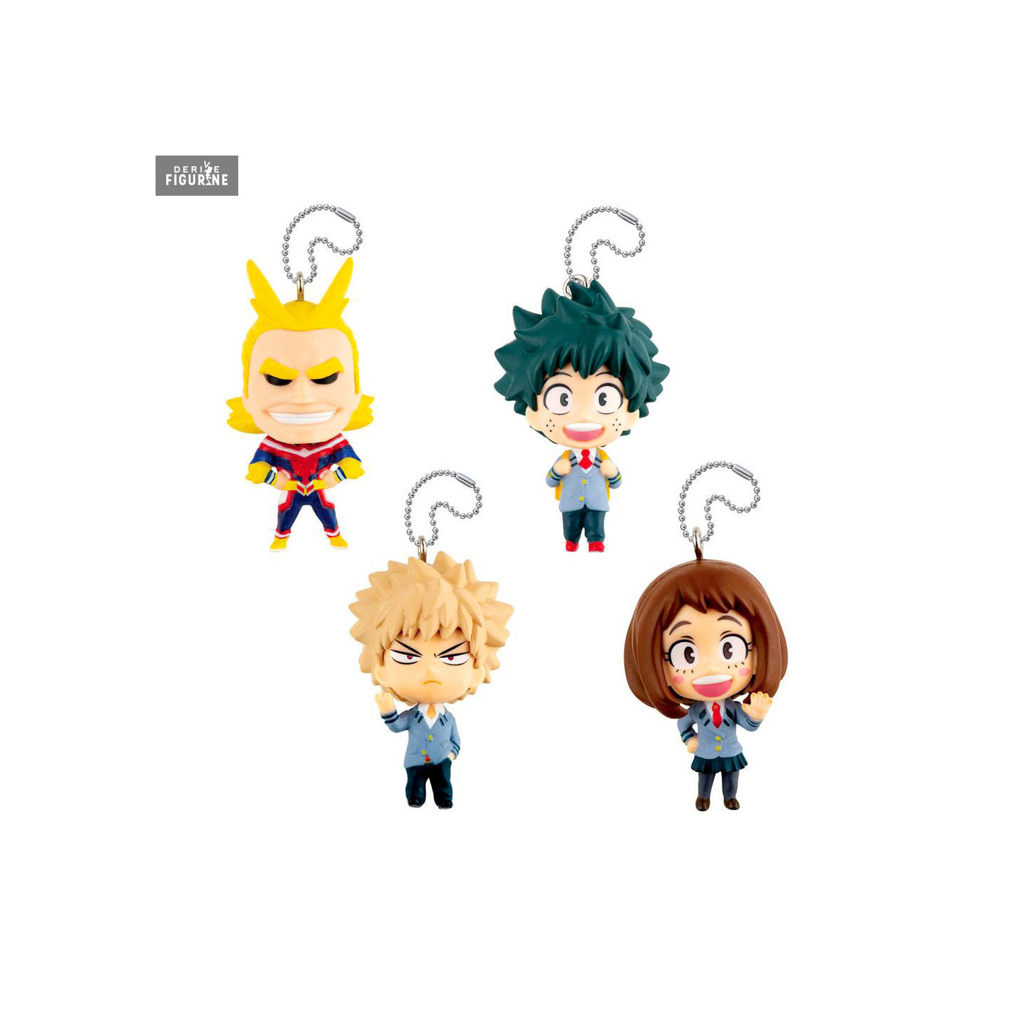 Une nouvelle vague de porte-clés de My Heros Academia vient de faire son apparition et va vous permettre d'avoir soit Izuku Midoriya, All Might, Ochaco Uraraka ou Katsuki Bakugo. Cette fois ils sont dans leur tenue d'écolier, sauf All Might qui a son costume de super-héros.