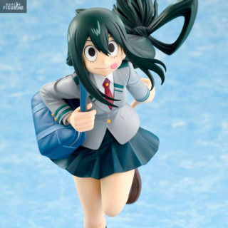Figurine officielle de Tsuyu Asui en PVC mesurant environ 18 centimètres de haut, à l'échelle 1/8. Le fabricant est Bellfine.