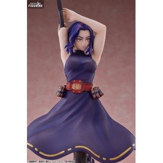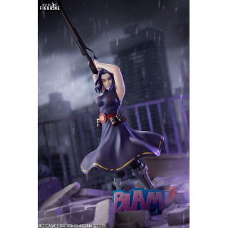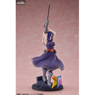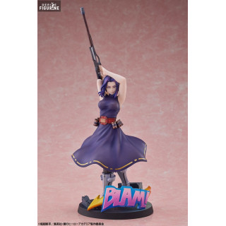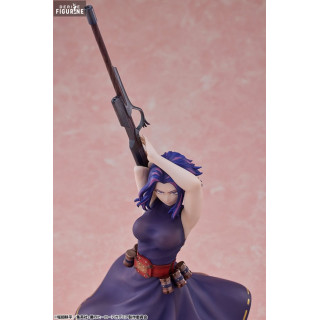 La figurine capture Lady Nagant dans une pose dynamique, prête à dégainer son fusil avec son regard perçant. Sa chevelure violette, caractéristique du personnage, flotte autour de son visage, ajoutant une touche de mouvement à l'ensemble de la statuette. Elle porte sa longue robe violette, cintrée à la taille par une ceinture où sont fixées des cartouches, symbolisant sa nature de tireuse d'élite. Les détails sont soigneusement reproduits, du design de sa jambe cybernétique aux plis naturels de sa robe. La base de la figurine arbore une expression audacieuse avec l’inscription "BLAM!" en relief, ajoutant une touche de dynamisme et rappelant le style des bandes dessinées.