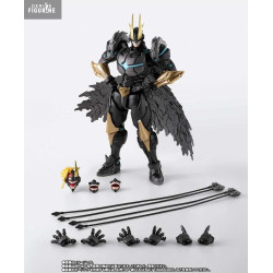 La figurine se distingue par son armure noire rehaussée de détails dorés et turquoise, lui conférant une esthétique à la fois élégante et agressive. Les lignes acérées, les plaques massives et la cape rigide en font une pièce visuellement percutante. La couronne stylisée sur le casque ajoute une touche royale au design déjà impressionnant.