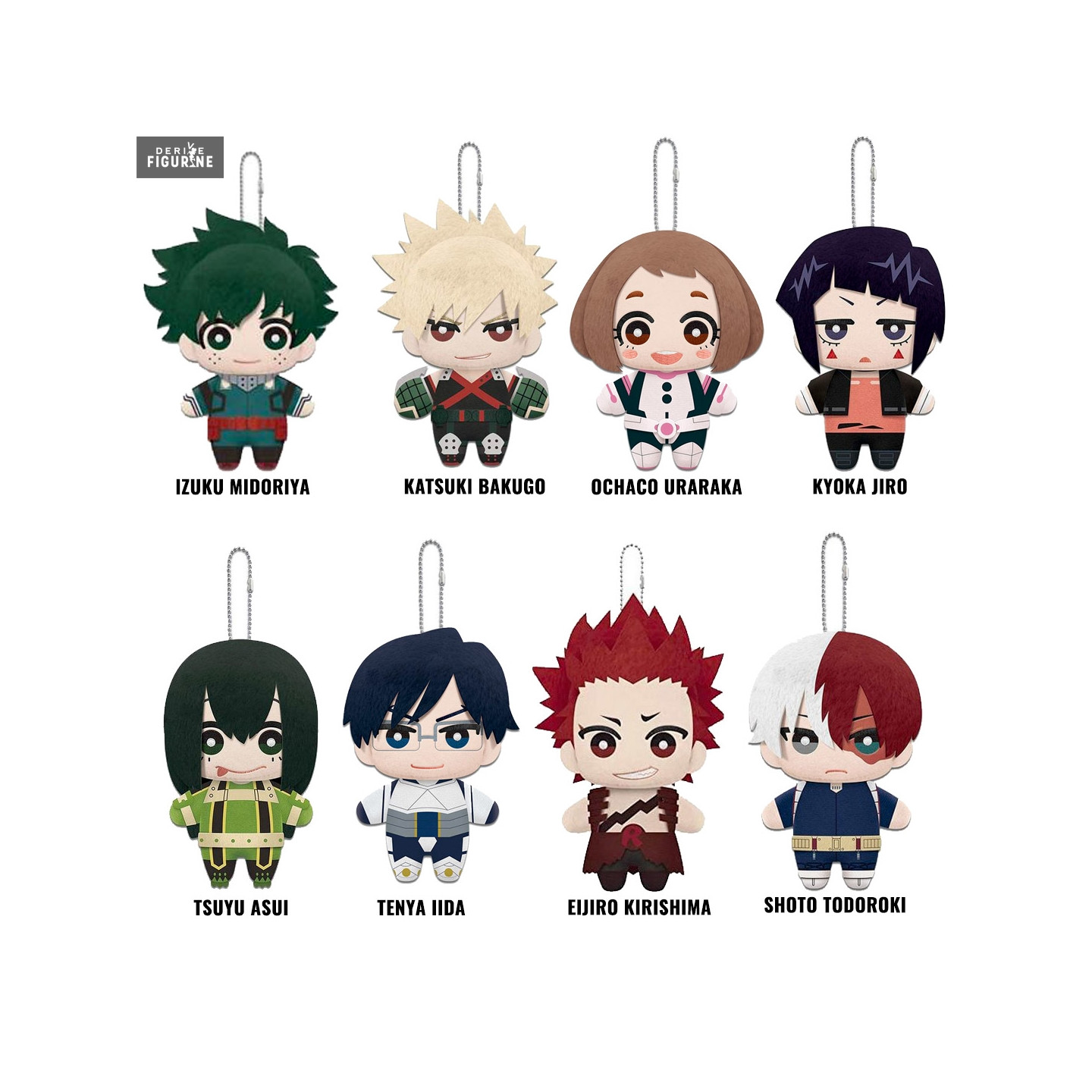 Peluche officielle au choix entre Midoriya, Bakugo, Uraraka, Asui, Iida, Todoroki, Kirishima ou Jiro, mesurant environ 15 centimètres de haut. Elle est issue de la collection Dangler. Le fabricant est Little Buddy Toys.