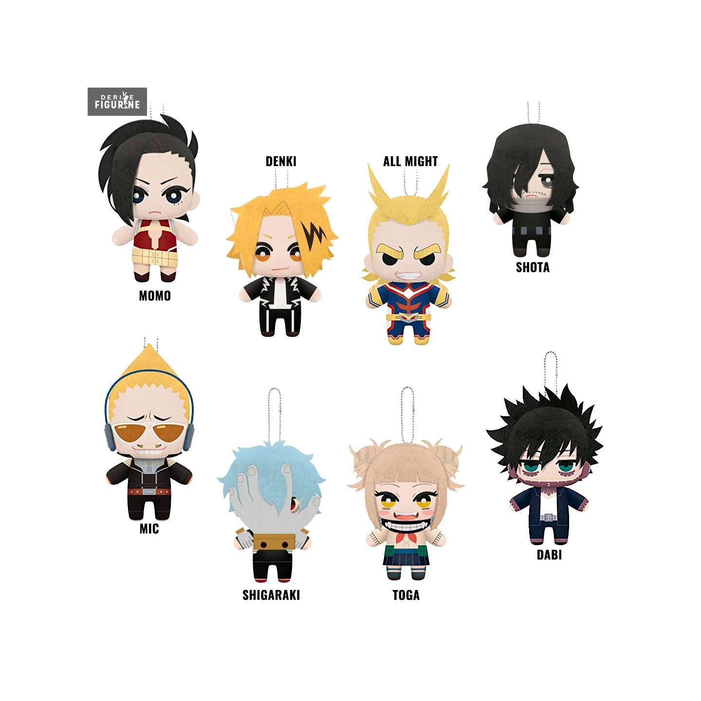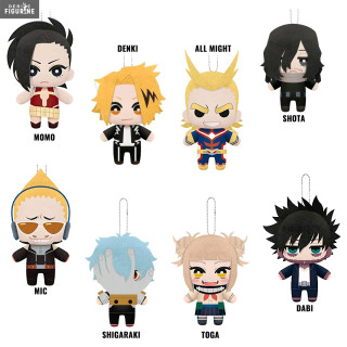 Peluche officielle au choix entre Momo, Denki, All Might, Shota, Mic, Shigaraki, Toga ou Dabi, mesurant environ 15 centimètres de haut. Elle est issue de la collection Dangler. Le fabricant est Little Buddy Toys.