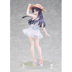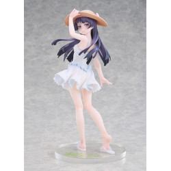 Visuellement, tout est pensé pour donner une impression de légèreté. Ses longs cheveux violets glissent le long de son dos en mèches souples, avec quelques pointes plus claires. Le chapeau de paille, au large bord, encadre son visage et apporte une vraie ambiance estivale. Elle porte une courte robe blanche à bretelles, au bas volanté et légèrement évasé, qui semble bouger avec le vent. Des sandales simples viennent compléter la tenue. L’ensemble repose sur un socle rond transparent décoré d’inscriptions vertes, qui garde la figurine stable tout en laissant toute l’attention sur Ruri.