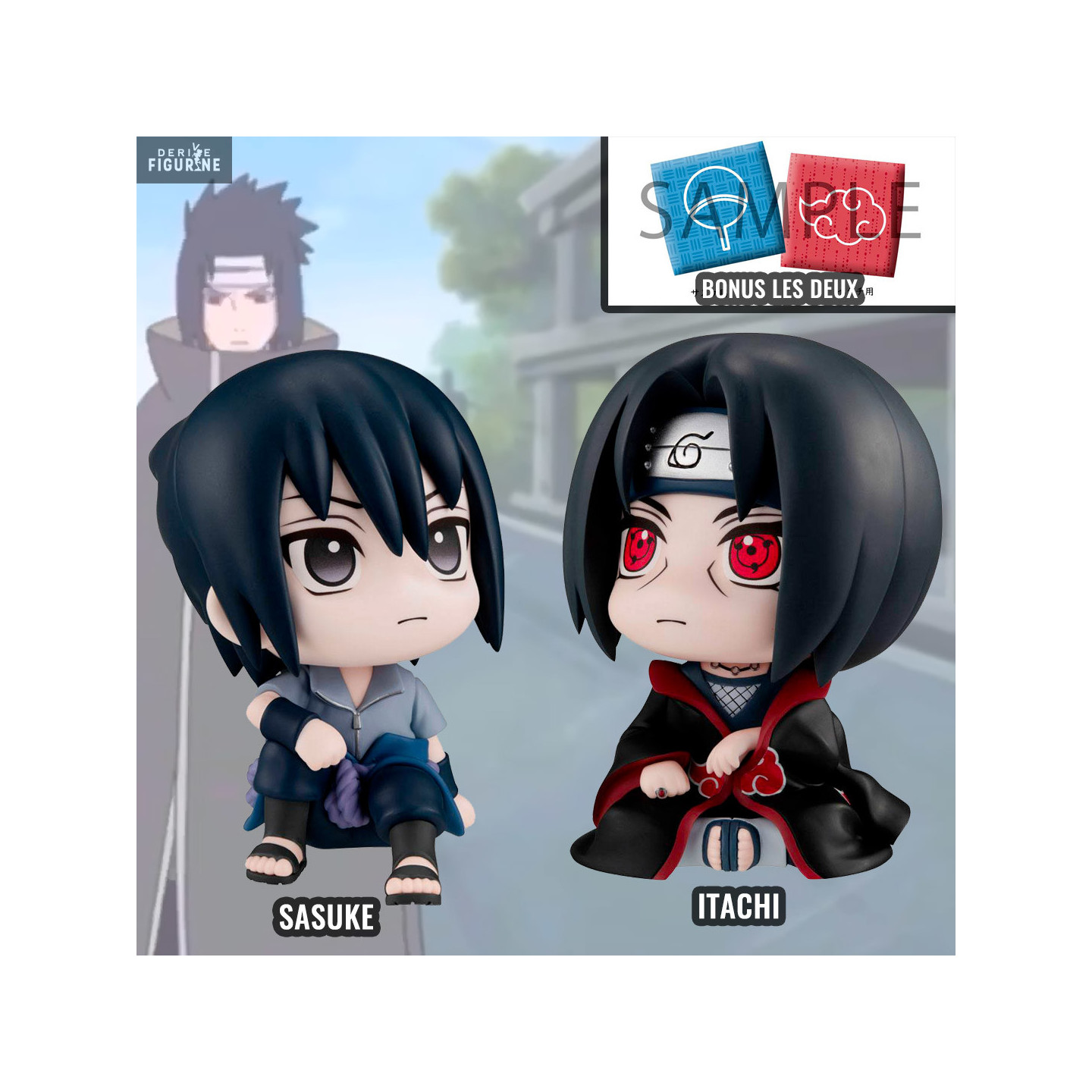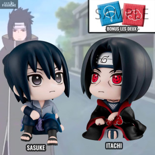 Les frères Uchiwa sont réunis pour vous dans cet article et surtout dans la collection Look Up. Il s'agit de petites figurines trop mignonnes avec la tête inclinable afin de vous regarder lorsque vous travaillez. Il y a donc Itachi avec ses sharingan dans les yeux et sa tenue d'Akatsuki en compagnie de son petit frère Sasuke avec sa tenue lorsqu'il rejoins les rangs d'Orochimaru. En bonus, vous aurez en plus deux petits coussins pour les exposer dessus.