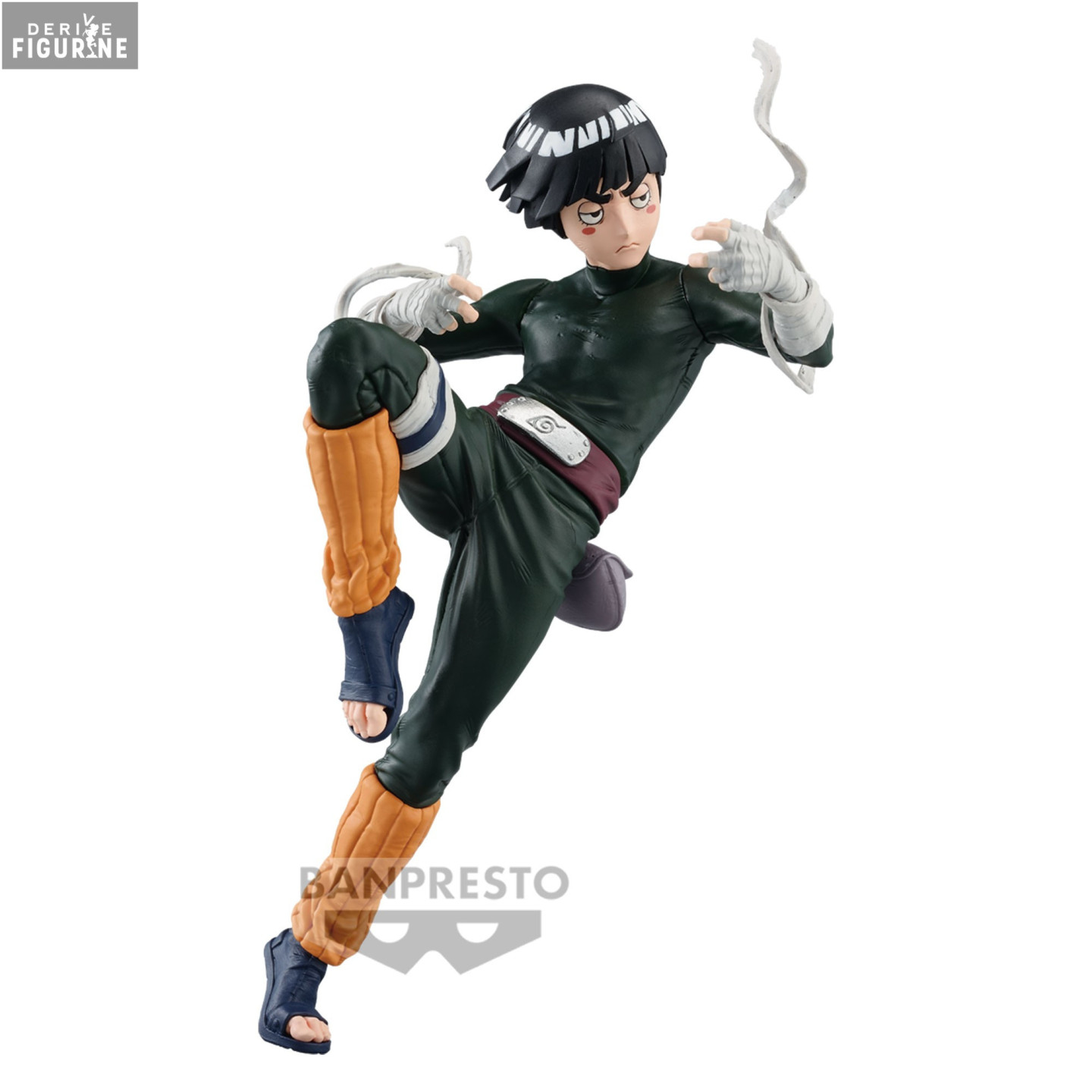 Cette représentation de Rock Lee démontre son style unique de combat, notamment sa posture célèbre du Poing ivre, qu'il maîtrise à la suite d'une prise accidentelle de saké. L'attention aux détails est remarquable, depuis les plis de son costume d'entraînement vert jusqu'aux bandages enveloppant ses mains et ses jambes, traduisant la précision et le réalisme que Banpresto apporte à ses créations.