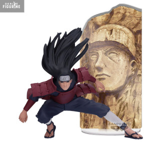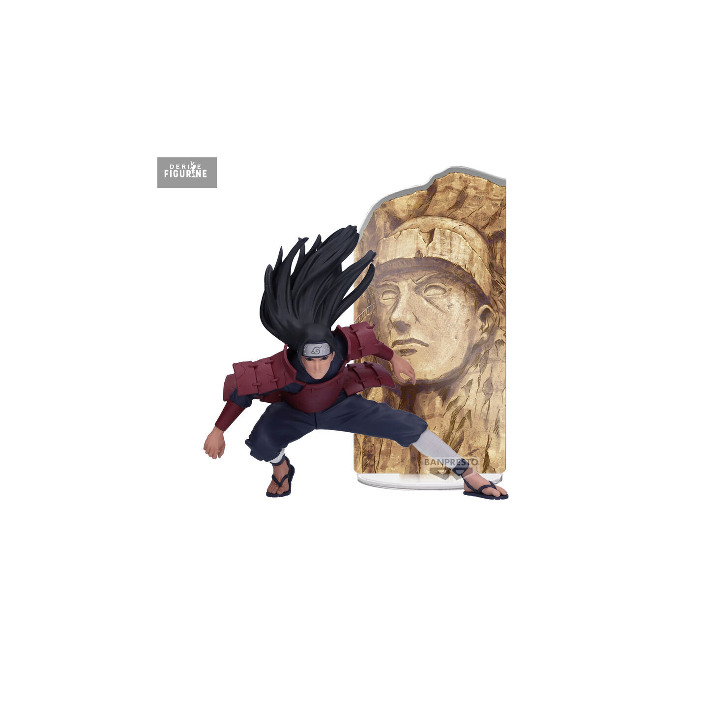 L'arrière-plan de la figurine est particulièrement remarquable, mettant en scène une réplique détaillée du Mémorial des Hokage sculpté dans la pierre, avec le visage imposant de Hashirama en relief. Cet ajout unique enrichit la présentation de la figurine, offrant une profondeur visuelle et une référence directe à son héritage en tant que premier Hokage.