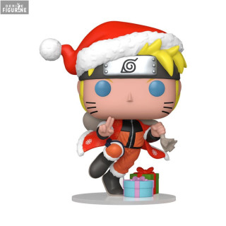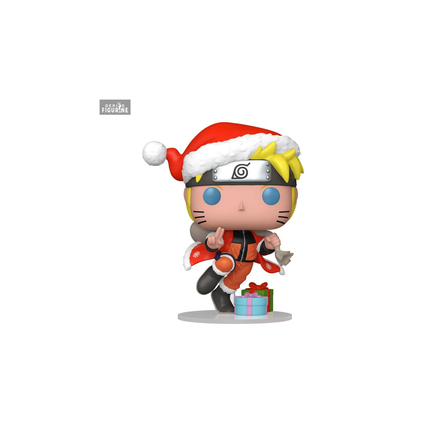 D’après l’image fournie, Naruto adopte une posture bondissante, une jambe en l’air, les doigts formant son mudra habituel. Il porte un sac rempli de cadeaux sur le dos, et deux présents colorés sont posés à ses pieds : l’un vert avec un ruban rouge, l’autre bleu pastel avec un nœud rose. Ses traits distinctifs — les marques sur ses joues et ses grands yeux bleus — sont bien visibles et fidèlement représentés.
