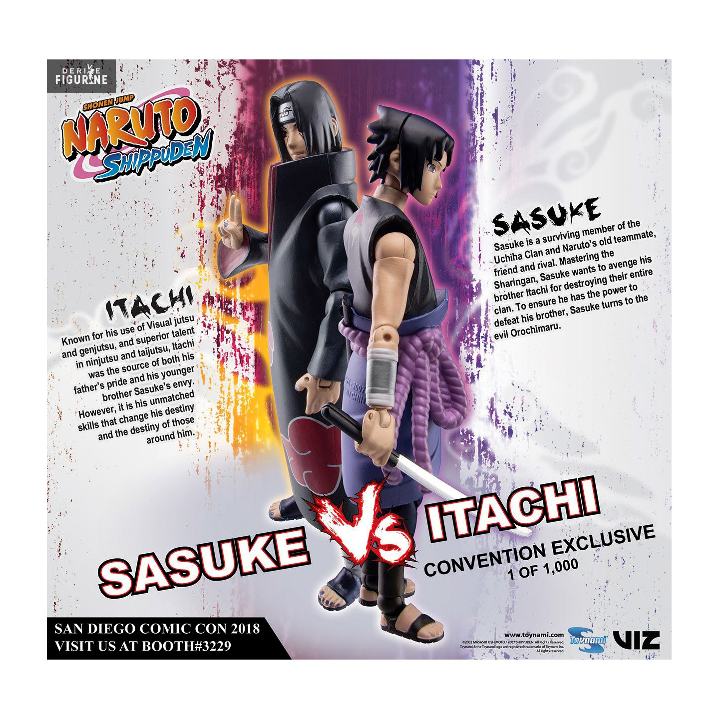Les deux frères Uchiwa se retrouvent dans un même pack de figurines à l'occasion du San Diego Comic Con 2018. D'une part vous avez Sasuke, le plus jeune et de l'autre son grand frère Itachi, alors si vous aimez les porteurs du sharingan, le pack est parfait pour vous. En plus, il est limité à seulement 1 000 exemplaires.